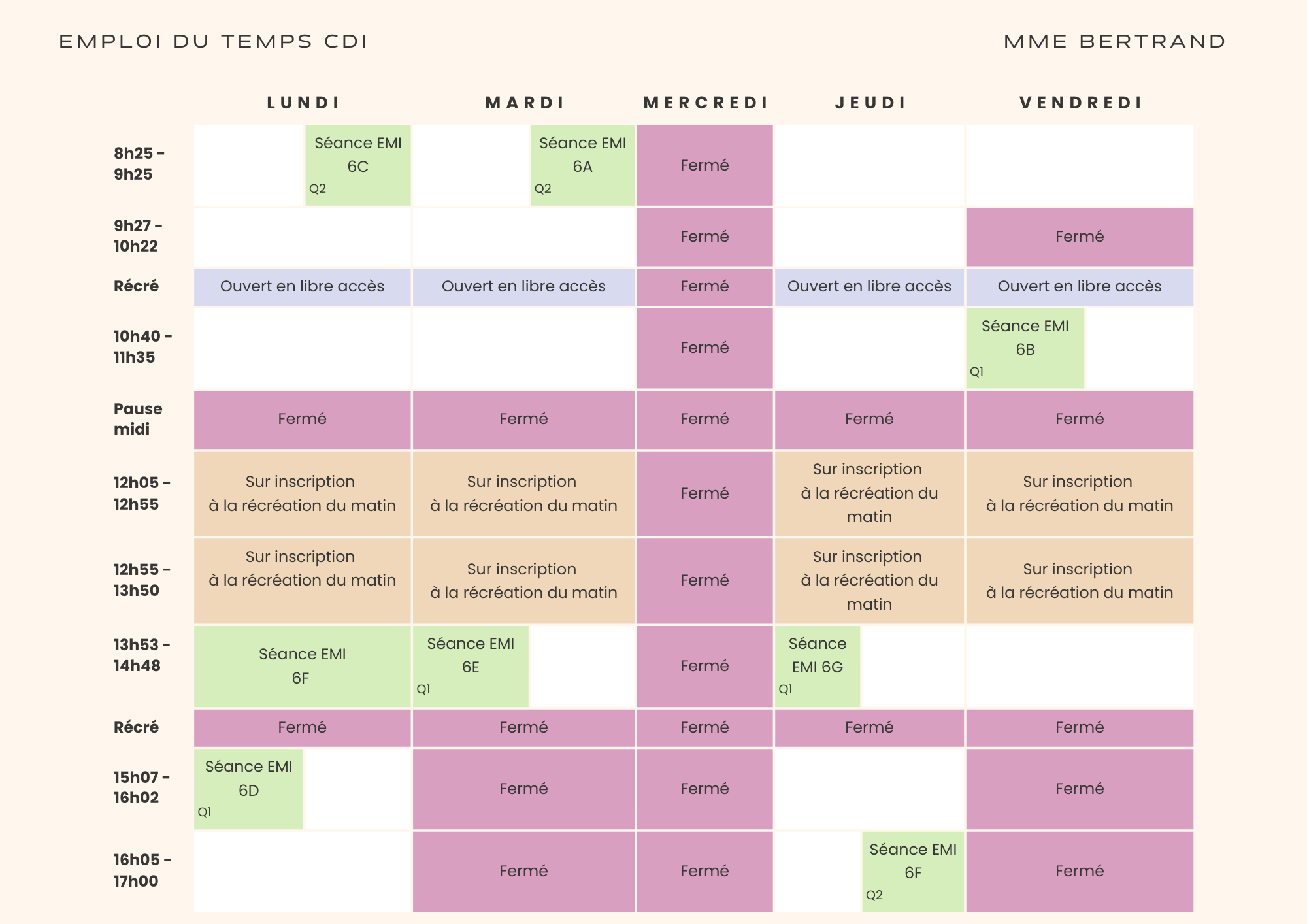 Attention, des séances en co-enseignement peuvent être planifiées et positionnées en cours de semaine. L'emploi du temps du CDI est donc modulable en conséquence.